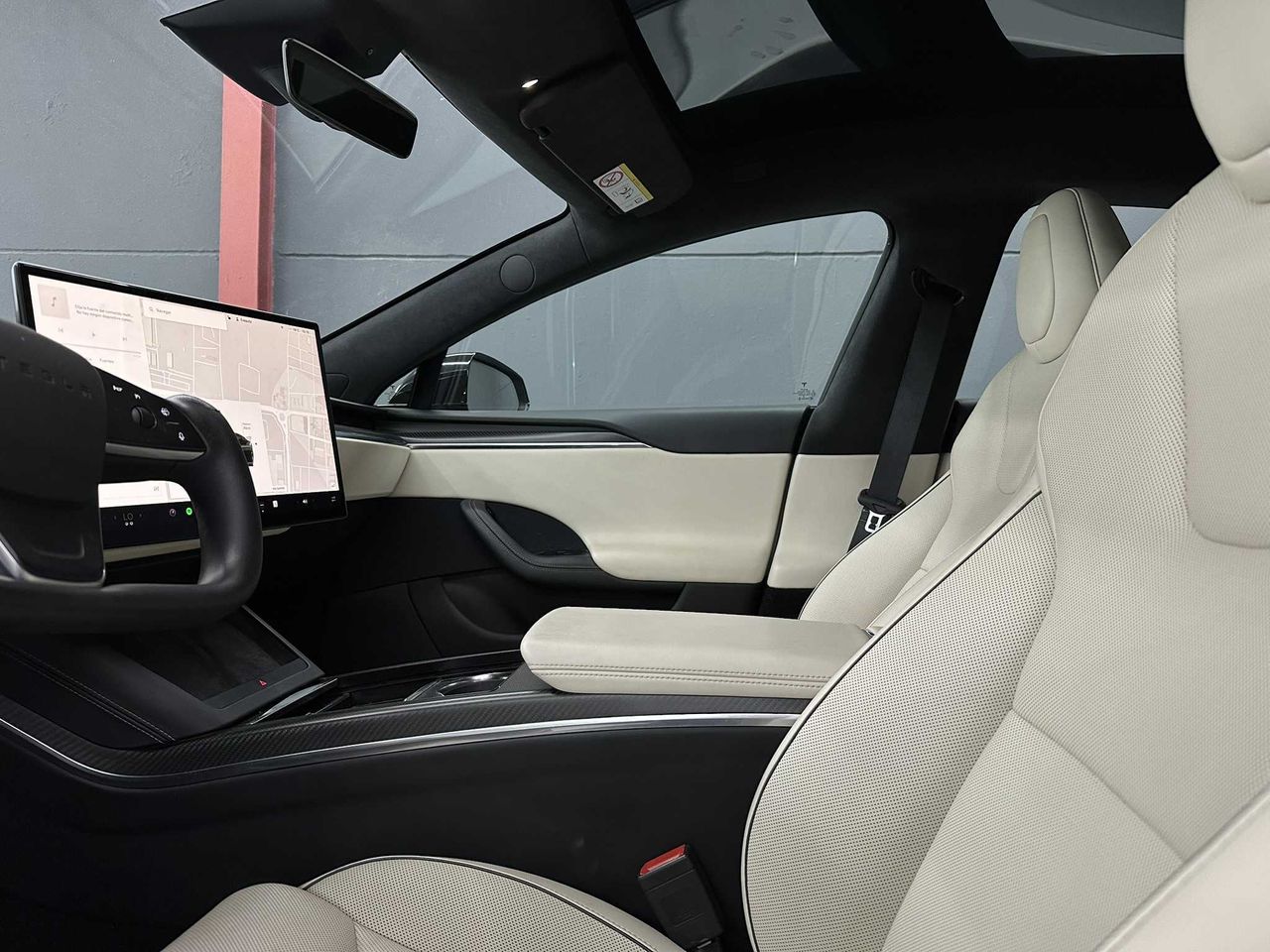 -Asientos ventilados con interior totalmente en blanco premium con decoración de fibra de carbono