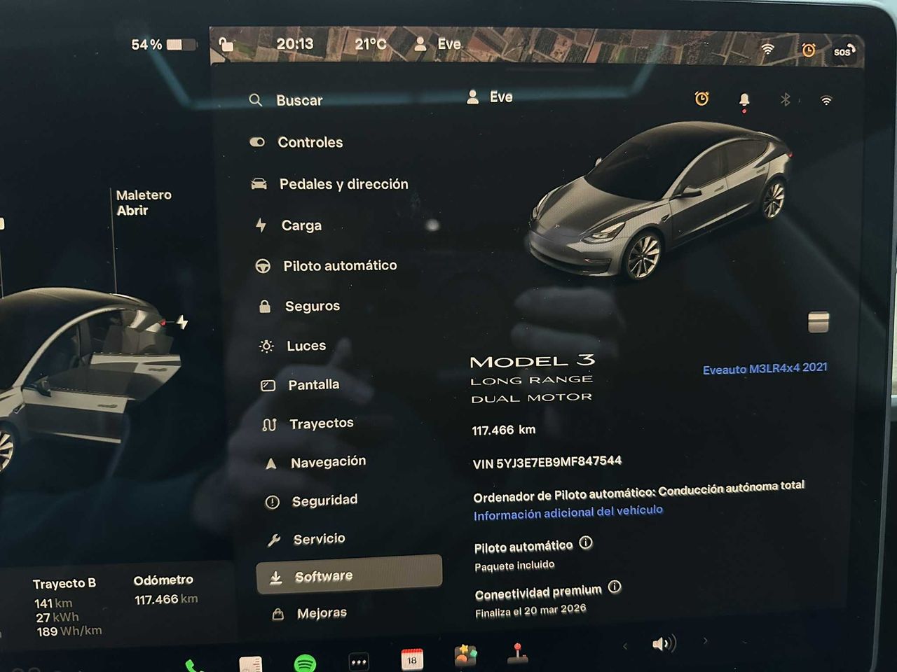 Tesla Model 3 Long Range Gran Autonomía con motor dual y tracción integral (460cv y de 0-100km/h en 3.9s). Primera matrícula 18/12/2020 y tiene 117.000km. Cuenta con una autonomía real de 500km. Garantía oficial en motores y batería hasta 2029 o 192.000km